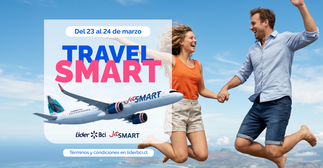 Promoción de 10% de descuento fijo adicional en todas las tarifas de vuelos nacionales e internacionales desde/hacia Chile en JetSMART.com, pagando con Tarjeta de Crédito Lider Bci. El descuento corresponde a un 10% fijo adicional, aplicable a todas las clases tarifarias disponibles al momento de la compra. Válida únicamente los días 23 y 24 de marzo o hasta agotar un stock total de 1.500 cupones disponibles para la campaña, lo que ocurra primero. Beneficio de un (1) uso por usuario. Para acceder al descuento, el cliente deberá ingresar el código promocional TSALEBCI en www.JetSMART.com al momento de cotizar su vuelo y pagar íntegramente con Tarjeta de Crédito Lider Bci. El beneficio será válido exclusivamente para pagos realizados con tarjetas de la alianza; en caso de intentar pagar con otro medio de pago, la transacción será rechazada. Válido para compras efectuadas con al menos 14 días de anticipación respecto de la fecha de vuelo, y disponible para volar entre el 7 de abril al 24 de junio de 2026. No aplica para vuelos con fecha comprendida entre el 29/04/2026 al 04/05/2026 y 20/05/2026 al 25/05/2026. Infórmate sobre la garantía estatal de los depósitos en tu banco y sobre las entidades autorizadas para emitir tarjetas de pago en Chile. Revisa quiénes se encuentran inscritos en los Registros de Emisores de Tarjetas en www.cmfchile.cl. Los productos y servicios no bancarios adquiridos son de exclusiva responsabilidad de sus respectivos proveedores, no correspondiéndole al banco intervención alguna en su entrega ni en la ulterior atención que ellos demanden.